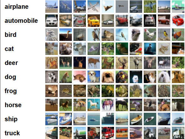 该数据集共有60000张彩色图像,这些图像是32*32,分为10个类,每类6000张图。这里面有50000张用于训练,构成了5个训练批,每一批10000张图;另外10000用于测试,单独构成一批。测试批的数据里,取自10类中的每一类,每一类随机取1000张。抽剩下的就随机排列组成了训练批。注意一个训练批中的各类图像并不一定数量相同,总的来看训练批,每一类都有5000张图。